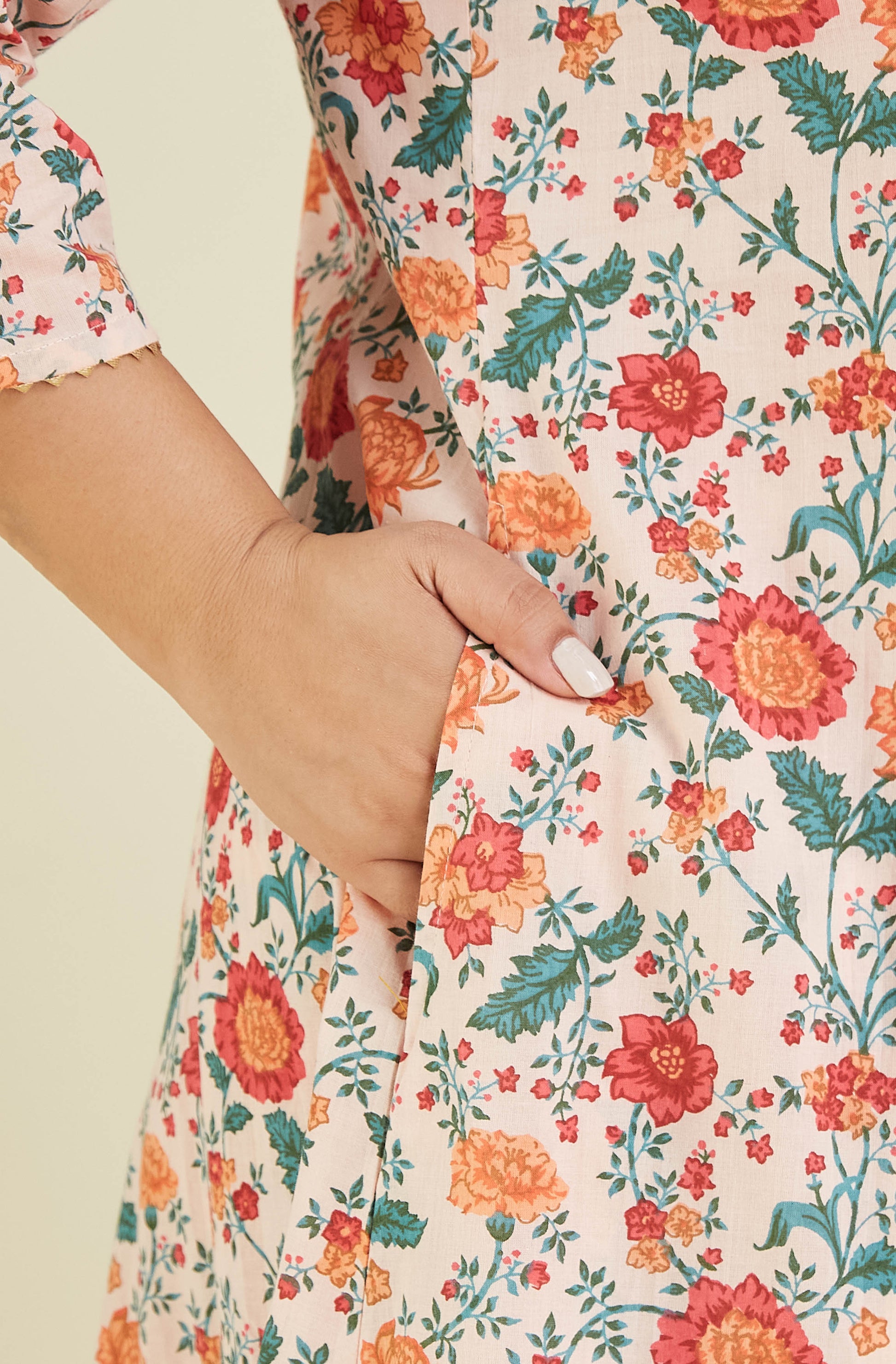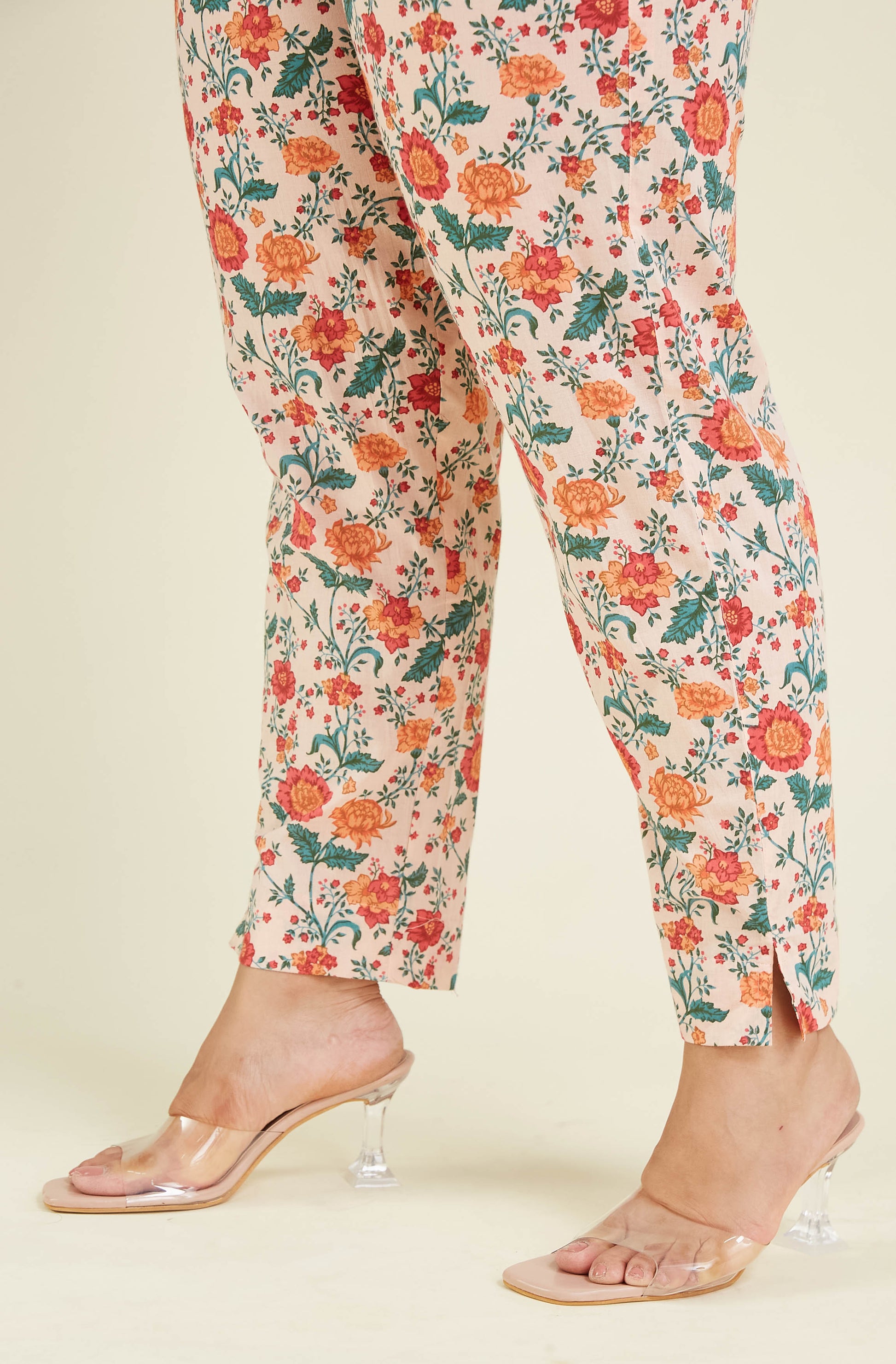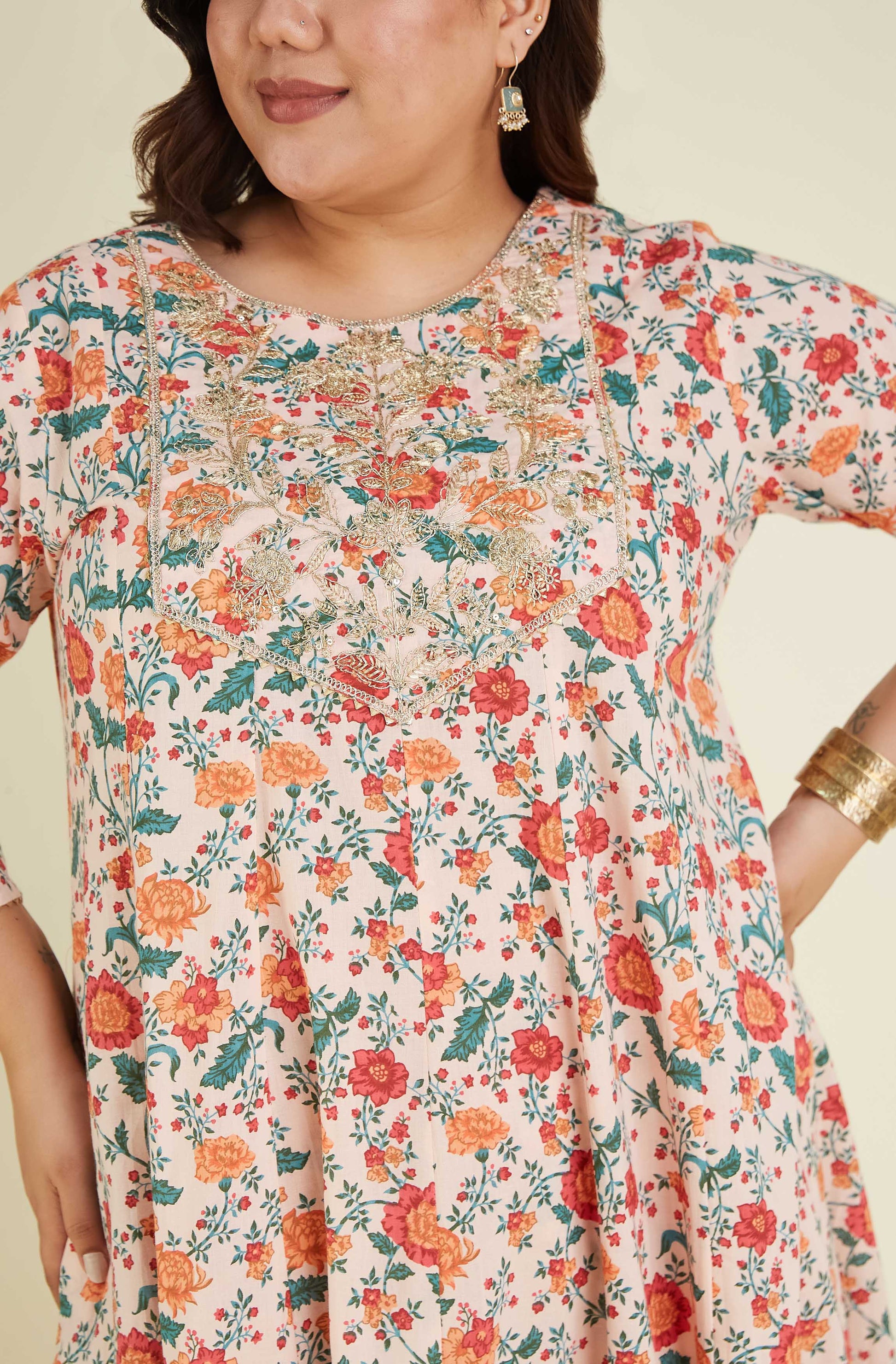 Festive and party wear pure cotton Anarkali kurti with zari and lace work floral print pattern and paired with pant and dupatta.