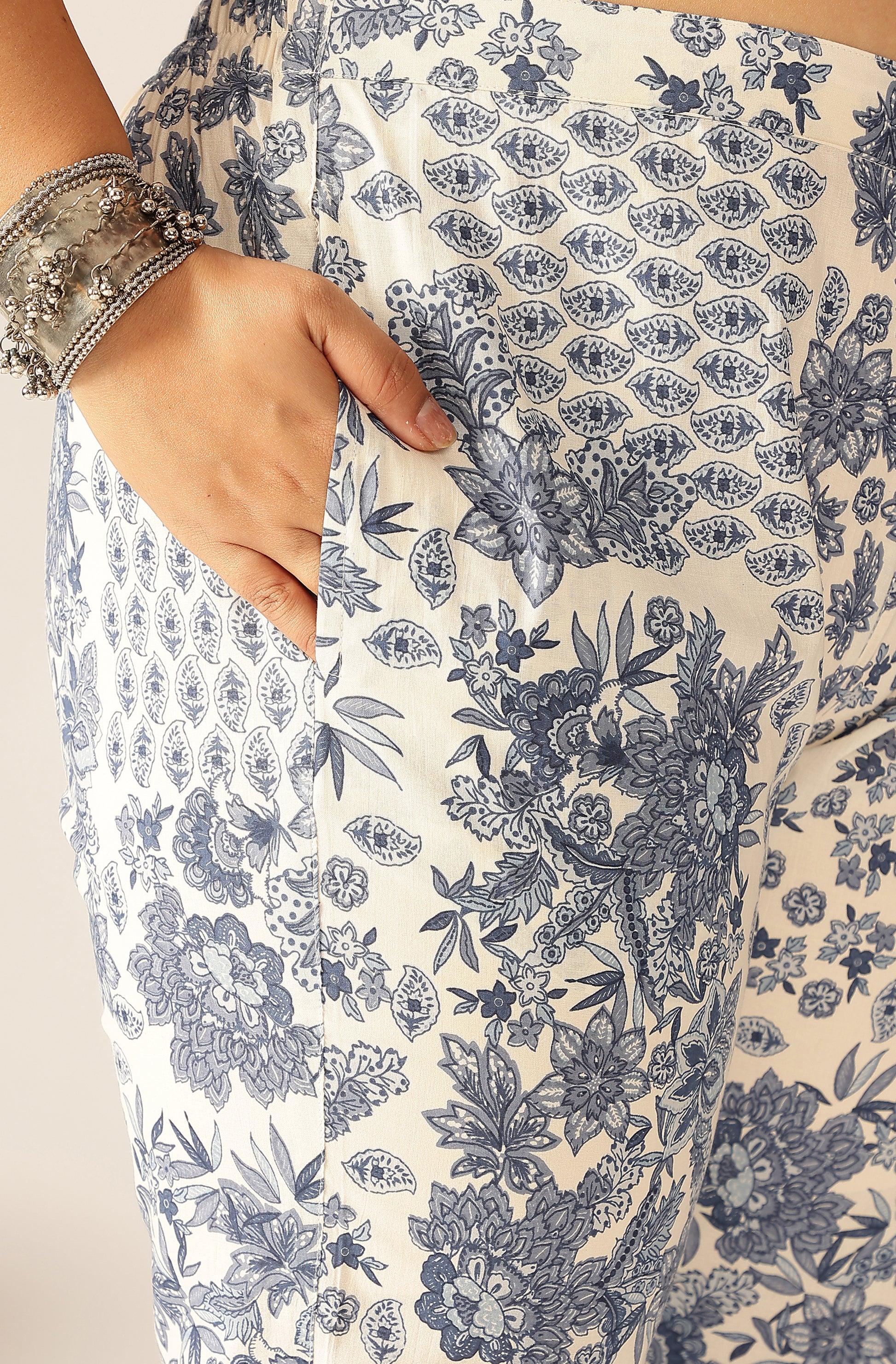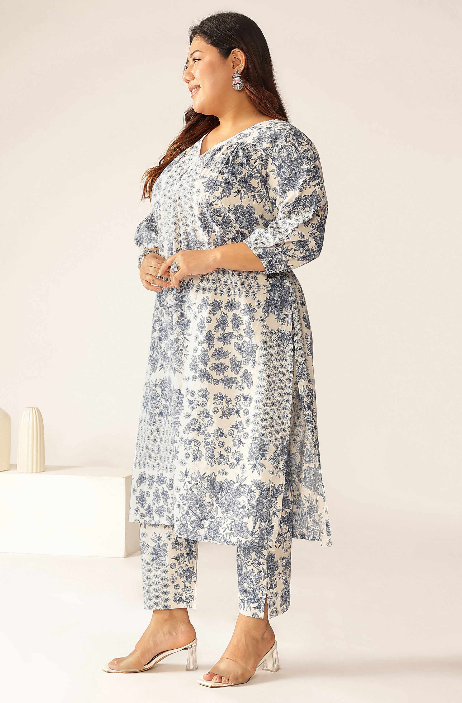 Pure cotton with floral print A-line Kurti with V-neck pattern and 3/4 sleeve with pant length 38 inches.