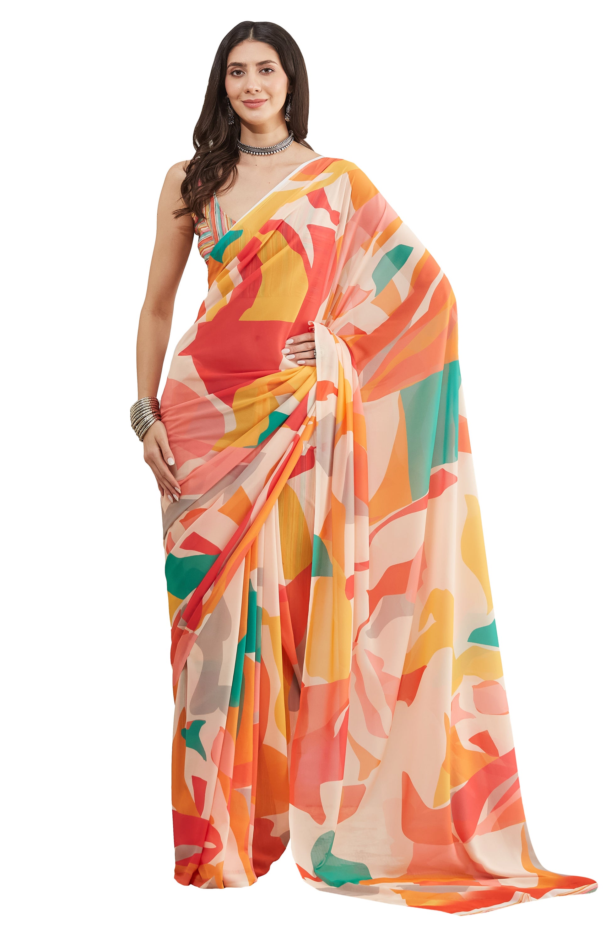 Multi colour casual premium georgette saree with unstitched blouse.