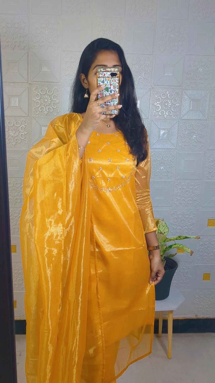 Trending sparkle twill tissue net fabric kurti with dupatta. The handwork on yoke parts is completely stunning look for festival wear